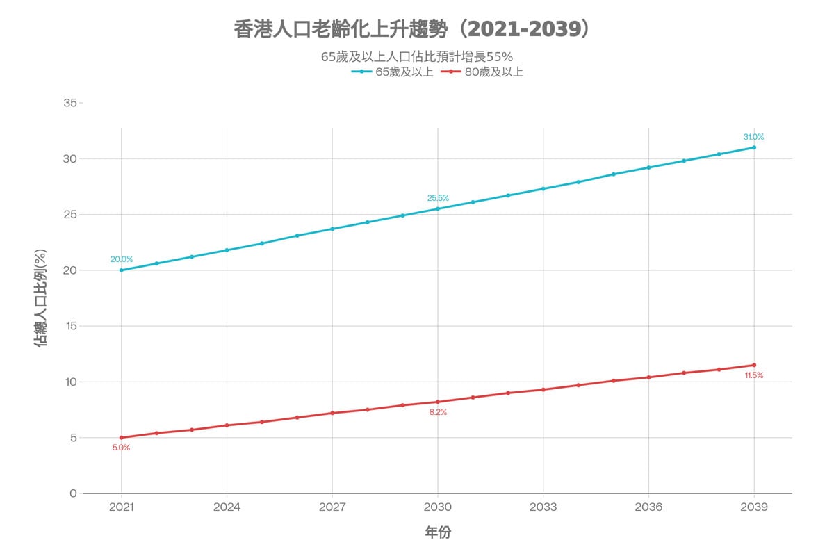據香港醫務衛生局資料,香港人口老化的速度位居世界前列。在2021至2030年的十年期間,將面對香港歷來最快的人口老化,65歲及以上人口的年均增長率將增至4.0%。至2039年,65歲及以上人口將由2021年的150萬(佔總人口的20%)上升至2039年的252萬(31%)。高齡長者(80歲及以上)的比例亦將由2021年的40萬(5%)迅速增至2039年的93萬(11.5%)。