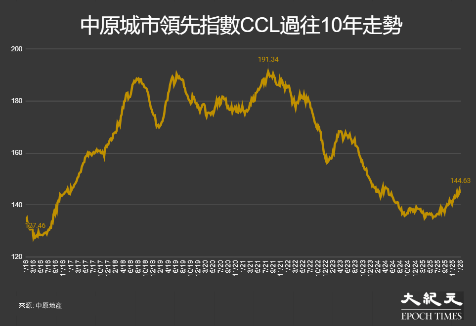 追蹤香港二手樓價的中原城市領先指數CCL於16日公布最新的數值為144.63點,截至1月11日,按周指數下降0.71%,連升兩個星期後回軟,按月則跌0.26%,自疫情爆發以來(2020年1月26日起)跌18.56%,而3年的累積跌幅為8.60%。大型、中小型單位按周分別錄得上升0.23%、下降0.90%,3年累積跌13.22%、跌7.61%。