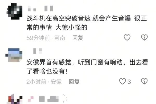 極目新聞報道,13日下午1時30分左右,蘇州市姑蘇區、吳中區、工業園區等多個區域傳出巨大的「轟隆」聲,不少人家中的窗戶隨之嗡嗡作響,吊燈甚至輕微晃動。在蘇州工業園區的張先生,當時會議室共有12名員工參與內訓,巨響持續約兩秒,有同事桌上的筆滑到地上。他組織人們避險,隨後迅速查看窗外情況,稱「沒看到火光,也沒聞到異味」。