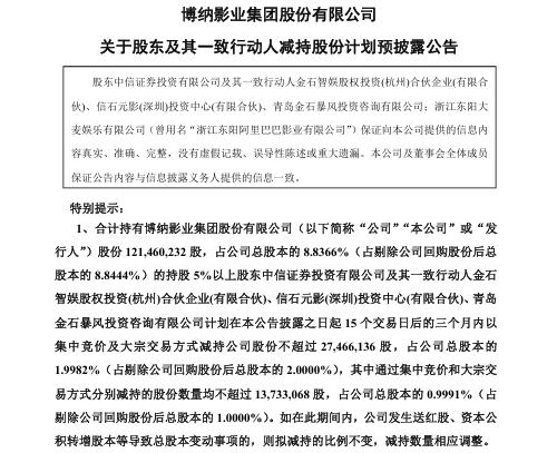 在業績不斷下滑的同時,公司股東還在減持股份。2025年12月26日,博納影業發布的《關於股東及其一致行動人減持股份計劃預披露公告》顯示,持股5%以上股東中信證券投資有限公司及其一致行動人,計劃在15個交易日後的三個月內,以集中競價及大宗交易方式減持不超2,746.61萬股,佔公司總股本的1.9982%。