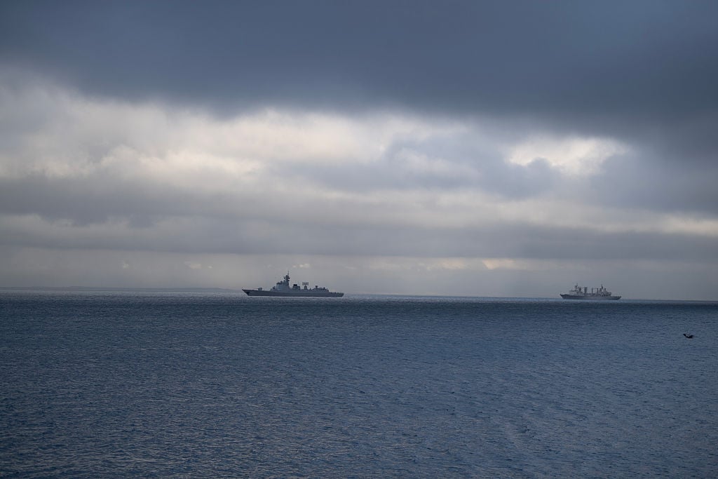 2026年1月6日,中共驅逐艦唐山號(122)和補給艦太湖號(889)進入南非開普敦附近的福爾斯灣,準備參加與俄羅斯、南非的軍事演習。(Rodger Bosch/AFP via Getty Images)