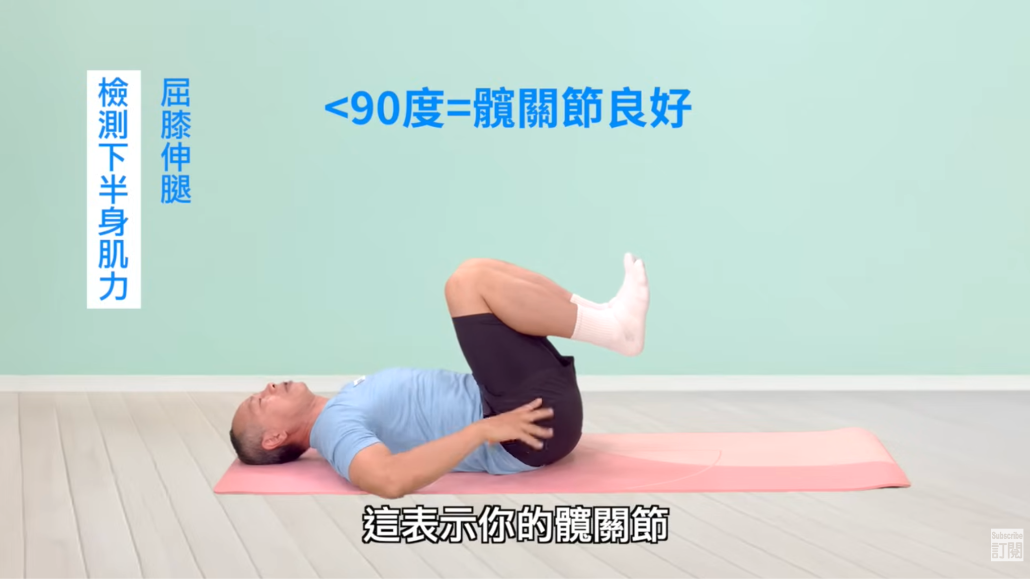 先做「屈膝伸腿」:躺下來,將手壓在地板,屈膝併攏腿,儘量縮進肚子,檢測腿與腹部是否可以小於90度。若可以,表示髖關節狀況還好。