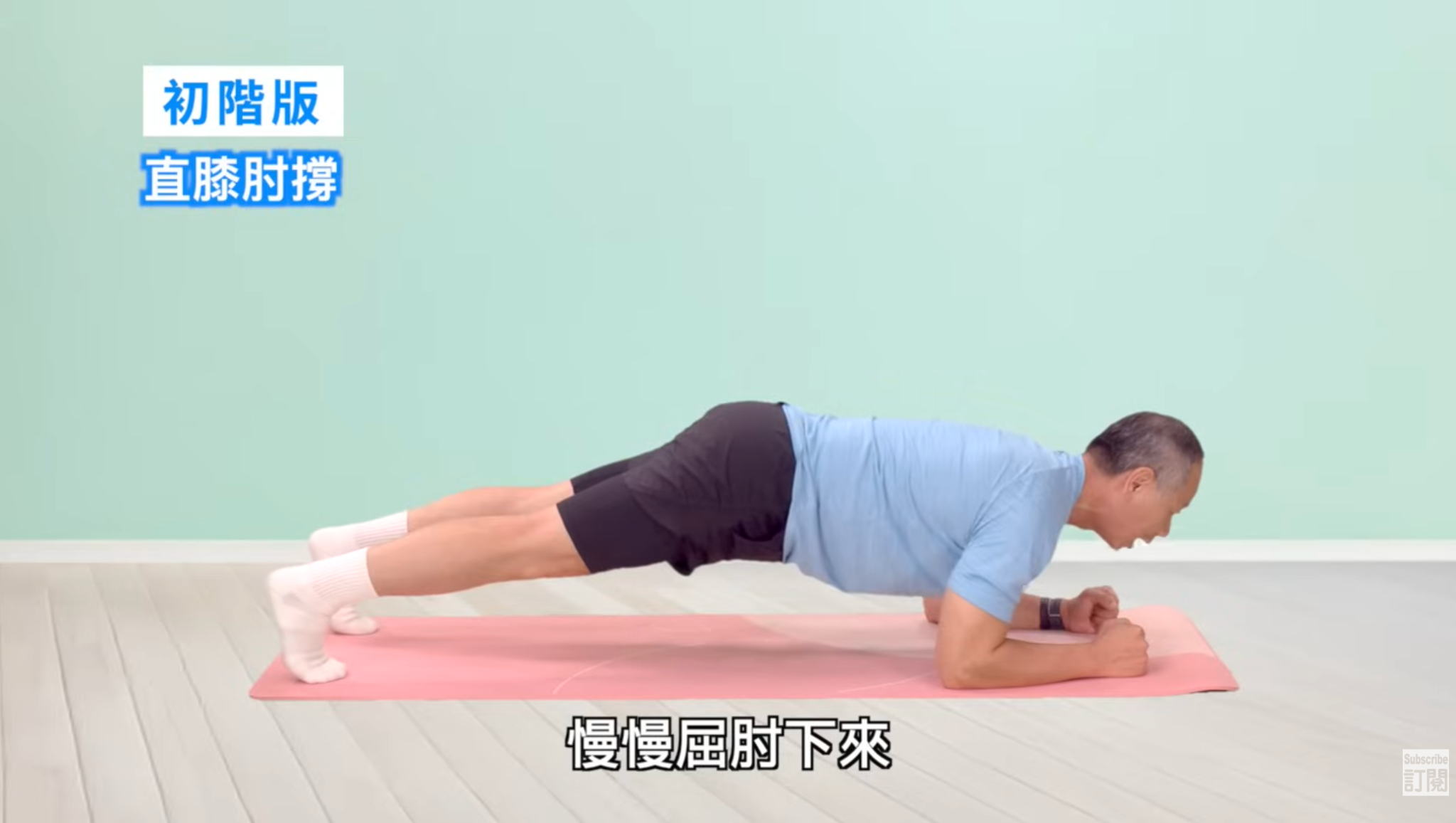 初階版(直膝肘撐):肩關節要趴下來,下巴儘量碰到瑜伽墊,慢慢推肘撐起來,膝蓋要離地,把身體整個撐起來。