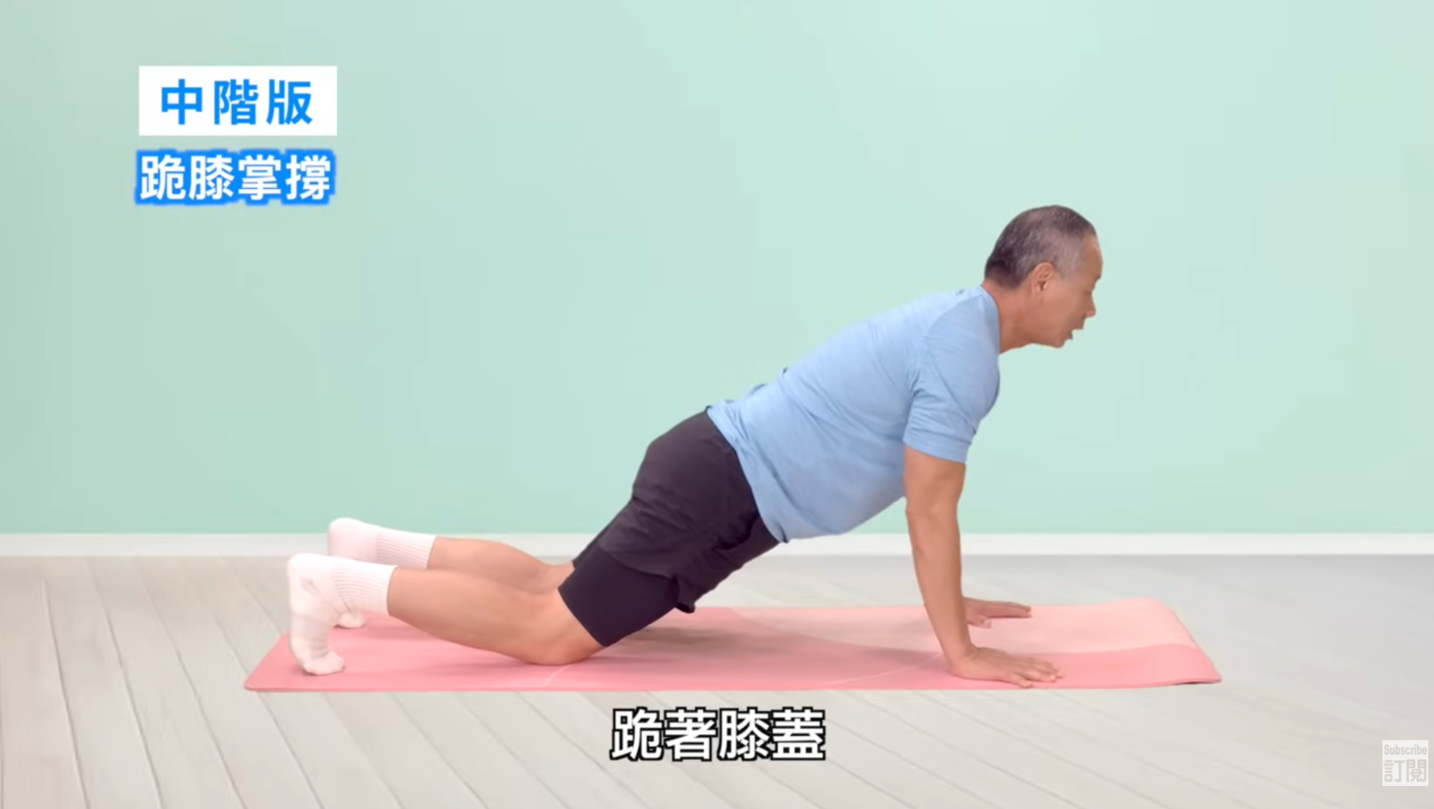 中階版(跪膝掌撐):同樣趴下來,手掌不要放太前面,儘量往後拉,拉到你的手腕手肘儘量垂直。推的時候用掌根來推,手指微微打開。膝蓋著地,慢慢推撐起來,把身體推離地板,慢慢屈肘下來。