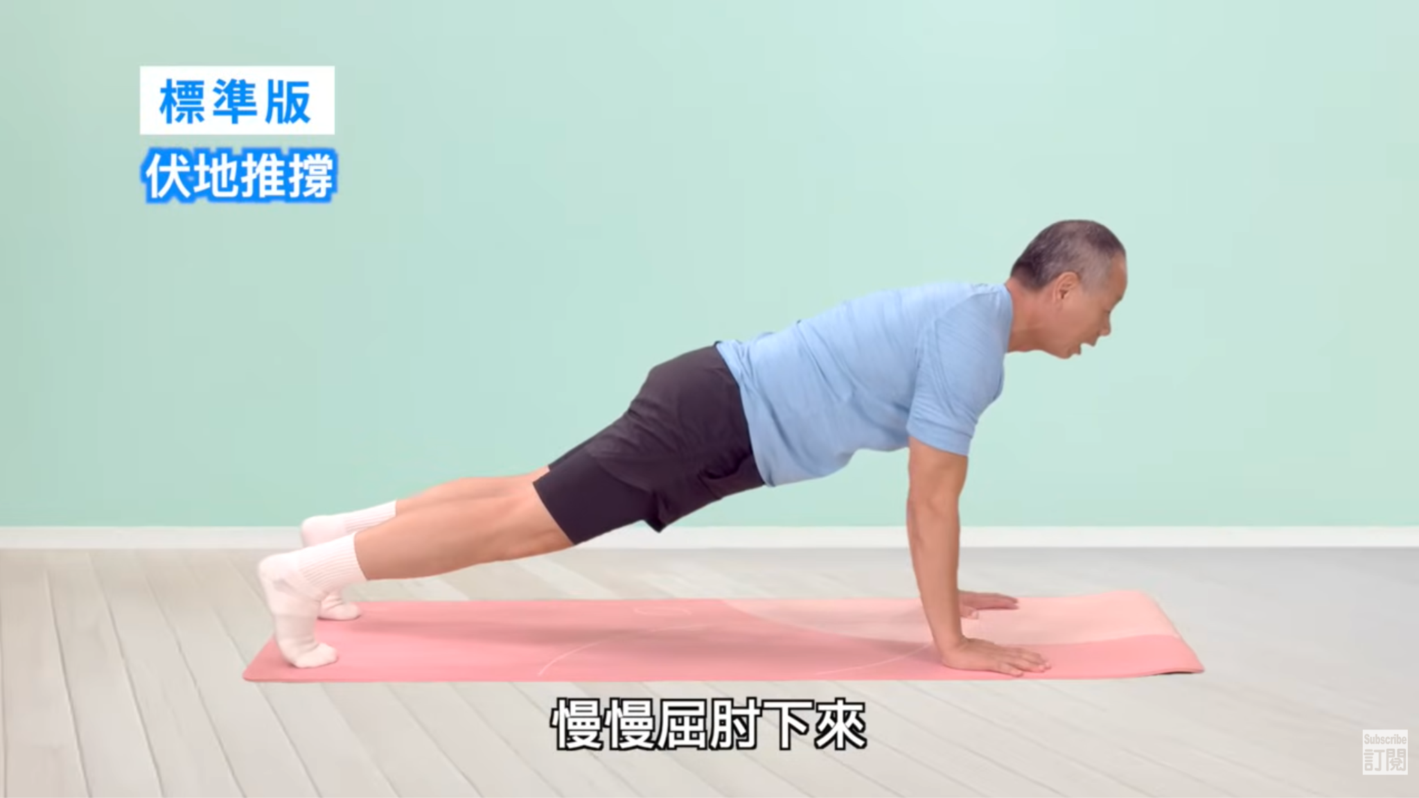 標準版(伏地推撐):在中階版基礎上,膝蓋推離地板。