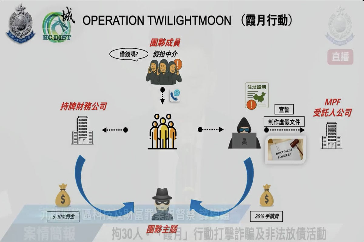 今次行動中,共拘捕30人,年齡介乎25至59歲,涉嫌「串謀詐騙」、「無牌放債」及「以過高利率放債」等罪名。被捕人士包括1名集團主腦、8名骨幹成員(6男3女),以及21名以虛假理由提早提取強積金的供款人。部份骨幹成員報稱無業或任職電話推銷員,警方指當中懷疑有人有三合會背景。所有被捕人現獲准保釋候查,須於3月中旬向警方報到。