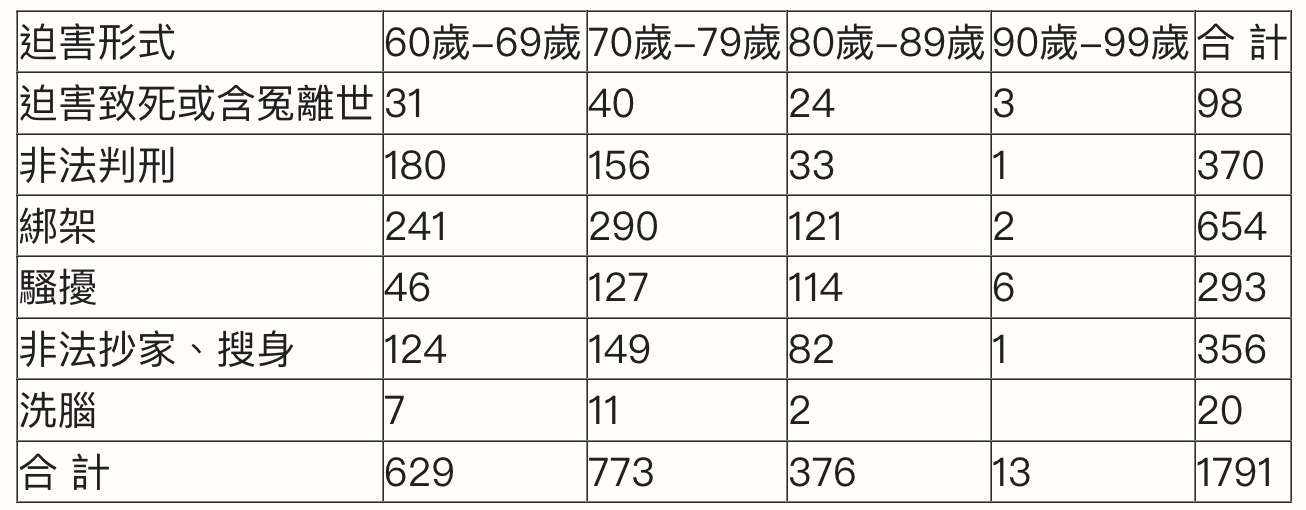 2025年至少4,803名法輪功學員遭綁架、騷擾,在已知年齡的1,053學員中,60歲以上的法輪功學員有947人,佔總數的89%。其中90歲以上8人、80歲至90歲236人、70歲至80歲416人、60歲至70歲287人。
