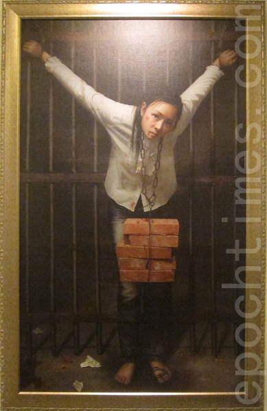 這幅樸實而深刻的繪畫中,一名女子雙臂被高高逆轉,捆綁在身後的鐵欄上;頸項上一圈鐵鏈垂掛五塊紅磚,把她的頭重重向下壓。她全身成一個十字,兩側是她被捆綁的雙臂;上方是她向上望的,潔淨如光的臉,嘴角和頰上有血跡,雙眼卻清澄如水;中間是那五塊沉重有裂痕的紅磚。畫的最下面,是她的一雙為鐵鏈覆蓋的赤腳。和這幅畫的畫風一樣,那是一雙無比誠實,有些稚拙的赤腳。