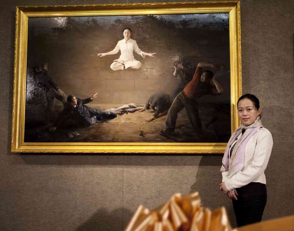 您還記得油畫大賽早期金獎作品:陳肖平的《震撼》?走入展覽現場,穿過一幅幅繪畫,我們筆直來到了一幅巨大的畫布前方。畫布上,一身白衣的女子挺身盤腿打坐,浮在半空中。她發出的光有如雷電,擊打在昏暗的獄警身上,使他們如受重擊,無法站立。站在這幅繪畫前方,我們也有如受到重擊,無法移動,定眼凝視這幅神奇的畫,畫中的奇蹟。