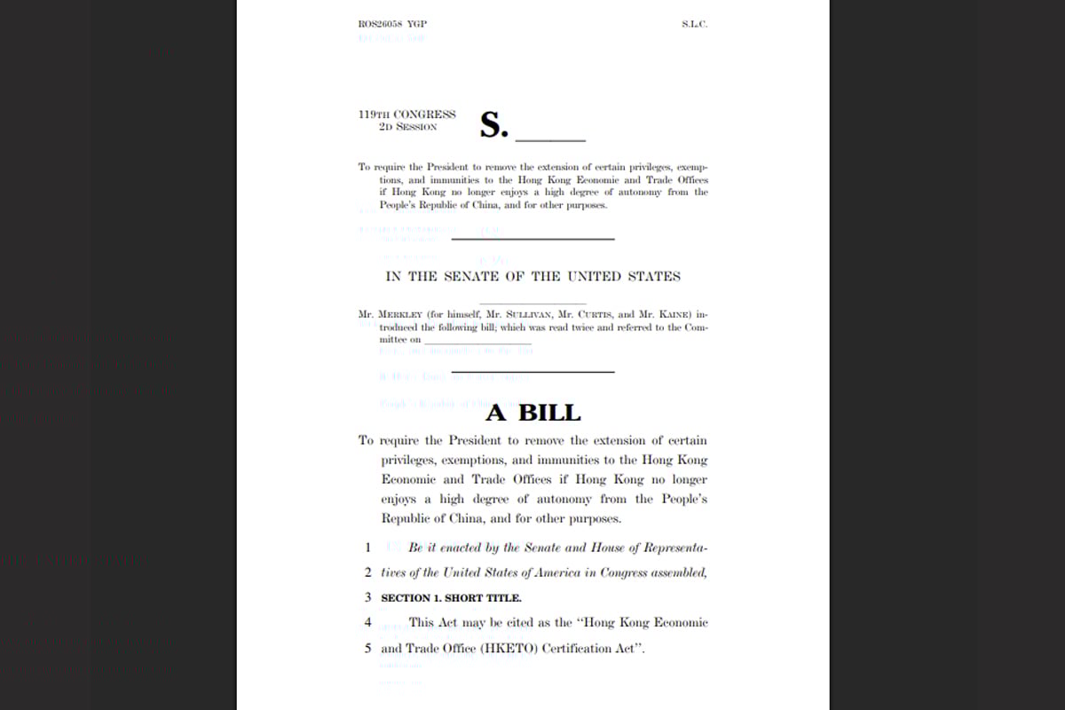 共和黨參議員蘇利文認為,自2019年以來,已明確證實香港的自治已死,所以香港繼續在美國保留獨立的外交據點已不具備合理性。另一提案人柯蒂斯則批評,中共將香港經貿辦視作「第二間大使館」,利用其在華盛頓發揮影響力並蒐集情報。