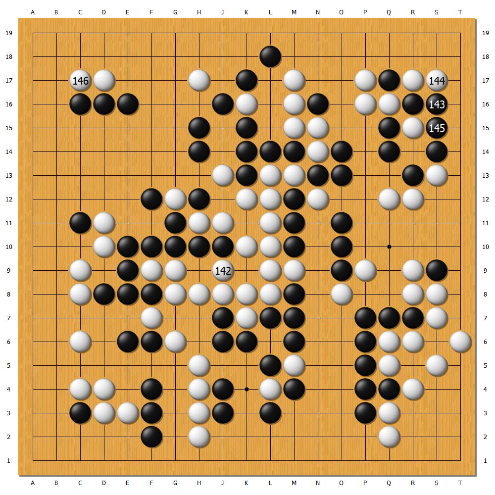 申旻埈是治孤能手,敵方戰略正中下懷。他利用黑棋各處破綻,不僅簡明做活大龍,行至白142手,還迫使對方後手在右上角補棋。