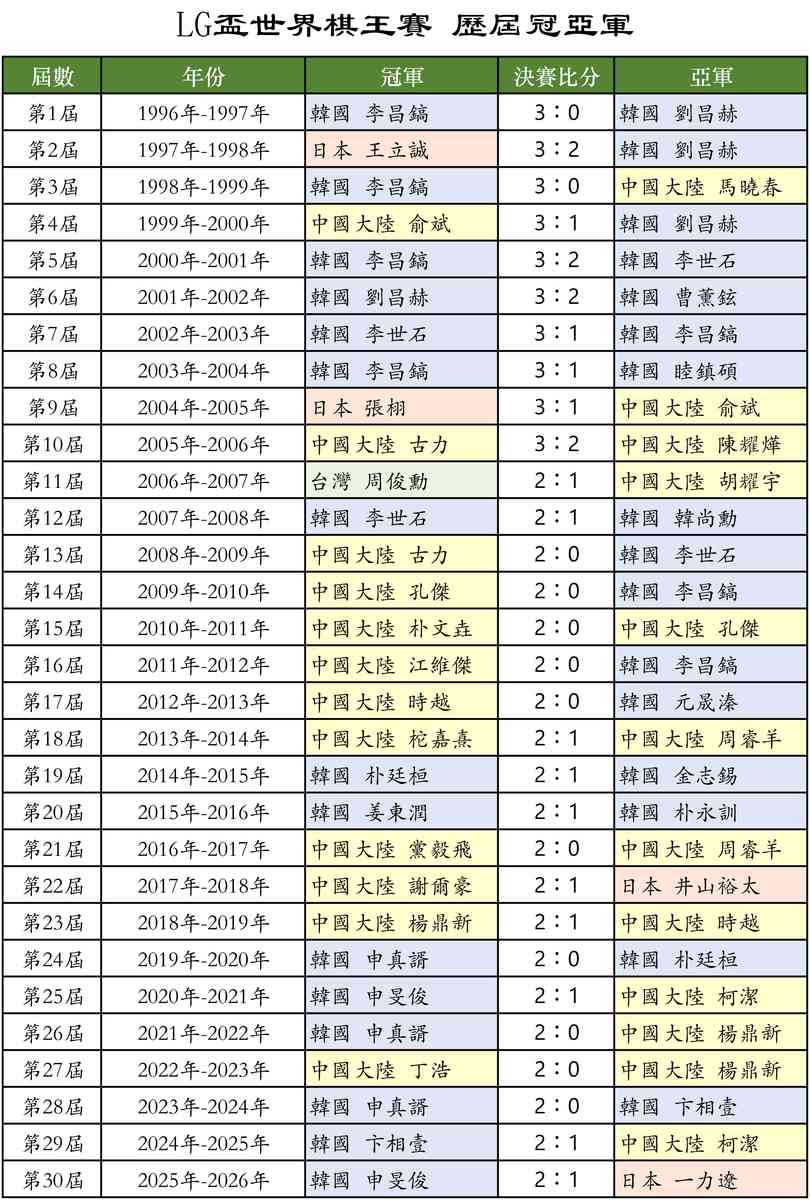 至此,第30屆「LG盃世界棋王賽」正式落下帷幕,韓國棋手摘得30屆賽事中的15屆桂冠,而中國大陸棋手12次稱王,日本和台灣棋手分別加冕2次和1次。
