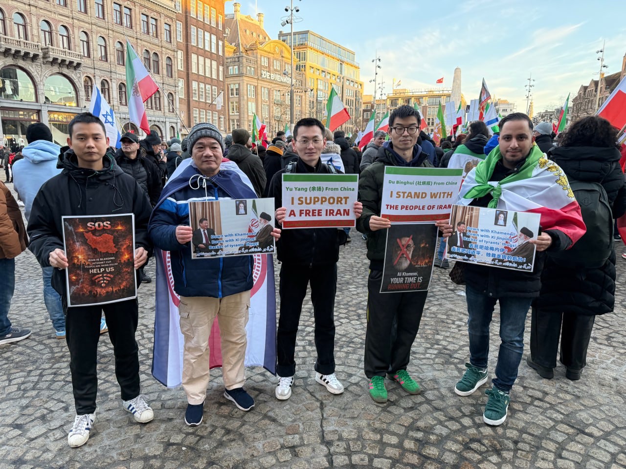 五位來自中國的民運人士也參與了這次活動——他們分別是來自河南洛陽的杜炳輝、廣西南寧的韋智堅、安徽的余揚,以及廣東的江培坤和劉飛龍。他們舉著用英文和波斯語雙語書寫的標語,表達對伊朗人民的支持。標語內容包括: