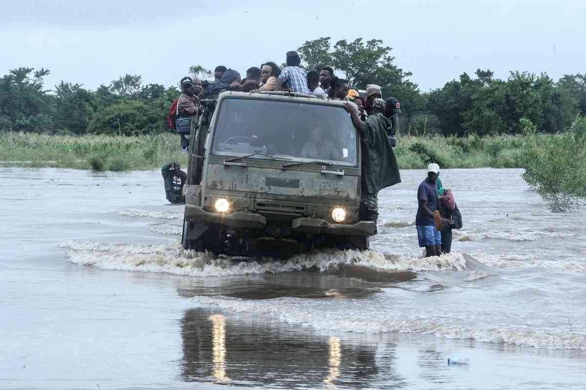 2026年1月16日,在莫桑比克南部馬普托省(Maputo Province)博阿內區(Boane District),一輛軍用貨車載著大批居民,準備穿過一條被洪水淹沒的街道。(Amilton Neves/AFP via Getty Images)