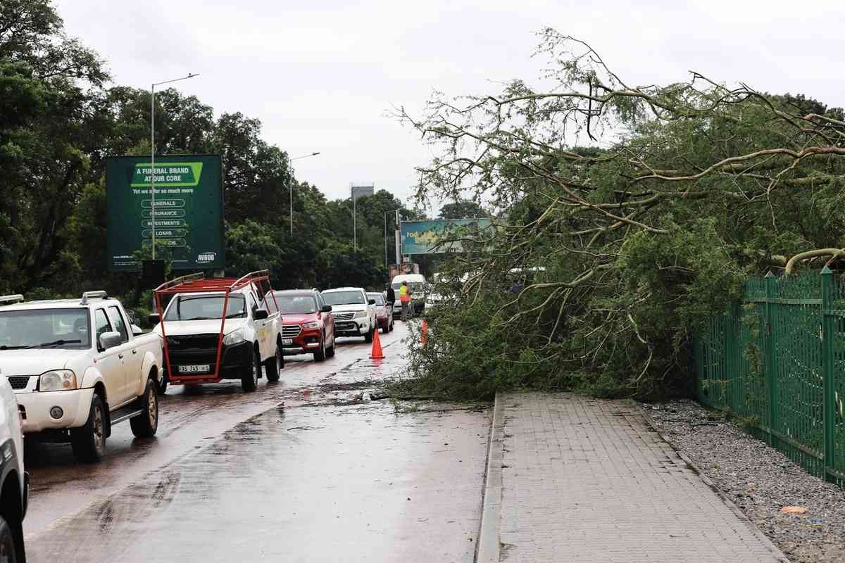 2026年1月12日,南非林波波省(Limpopo)吉亞尼市(Giyani),一棵大樹因強風暴雨倒伏在路邊的柵欄上。(Orlando Chauke/AFP via Getty Images)