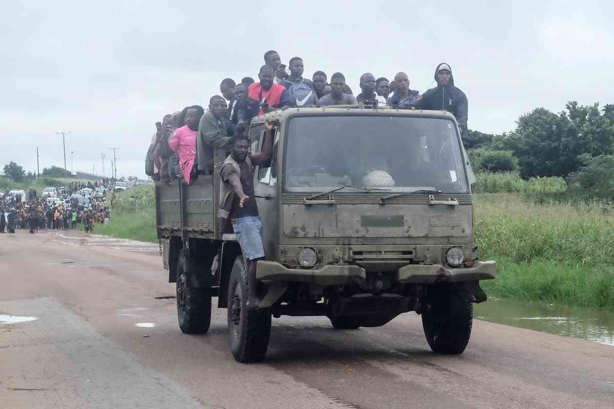 2026年1月16日,在莫桑比克南部馬普托省(Maputo Province)博阿內區(Boane District),一輛軍用貨車載著大批居民穿過一條被洪水淹沒的街道。(Amilton Neves/AFP via Getty Images)
