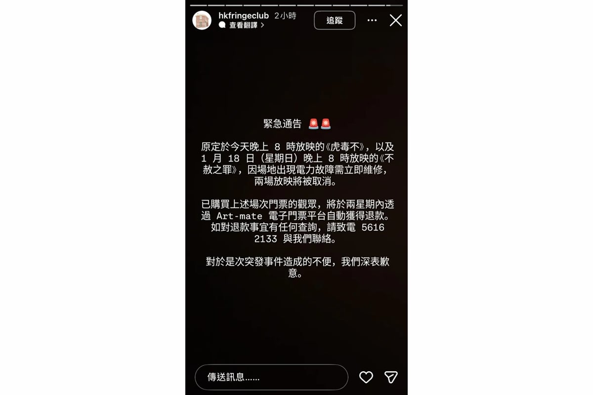 第44屆香港電影金像獎日前正式公布參選名單,《不赦之罪》、《送院途中》等4部原定符合資格的電影意外「被消失」。昨日(17日),中環藝穗會於社交媒體發出緊急通告,稱由於「場地出現電力故障需立即維修」,原定於昨晚及今晚(18日)放映的電影《虎毒不》及《不赦之罪》將會取消。館方對此突發事件深表歉意,並表示已購票的觀眾可於兩星期內透過Art-mate電子門票平台自動獲取退款。