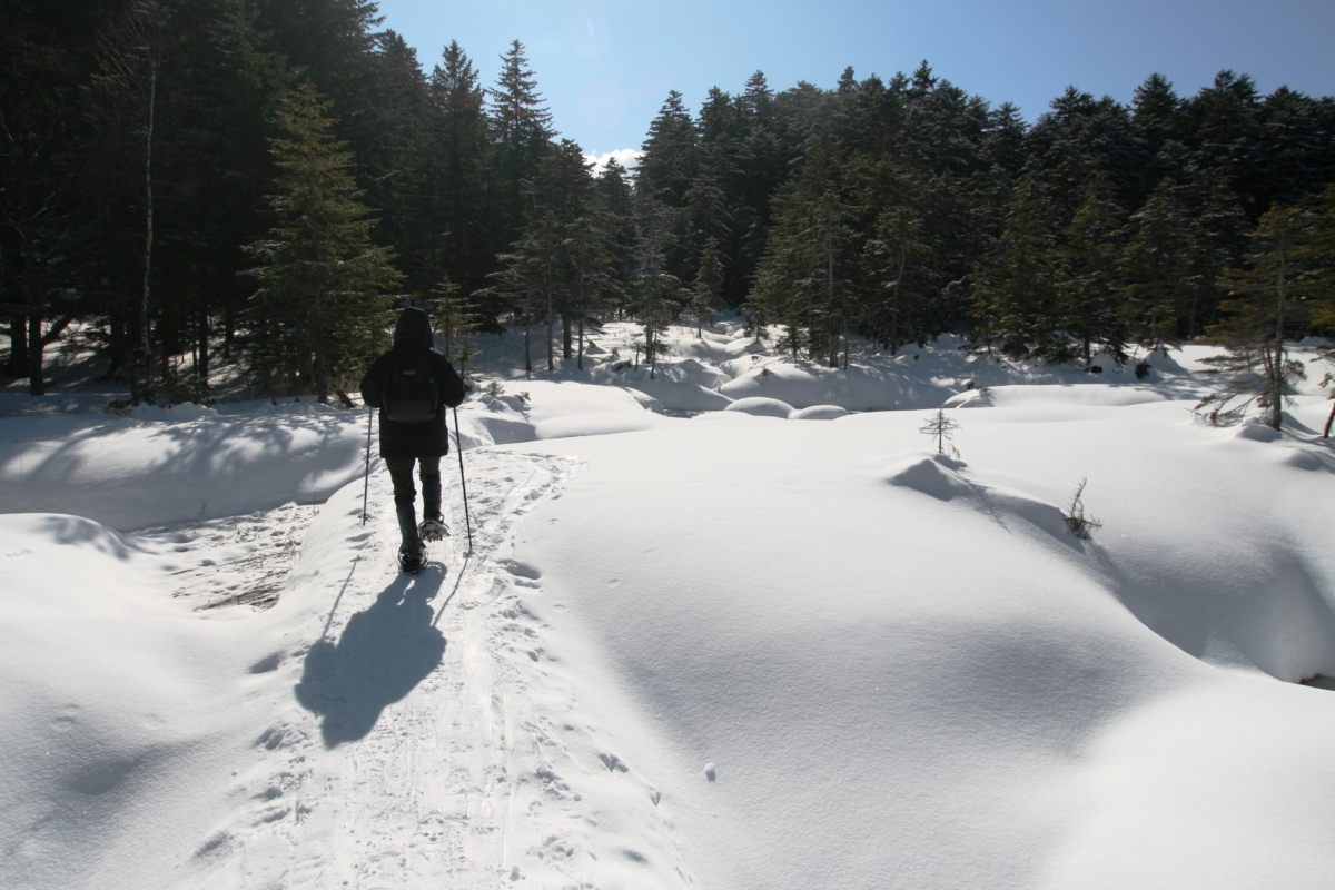 經過一夜好眠,隔日清晨,租借了雪鞋與登山杖,從門前國家公園步道入口出發,展開「冰雪奇緣」。這對生長在南國的我們,可真是一趟驚奇之旅。