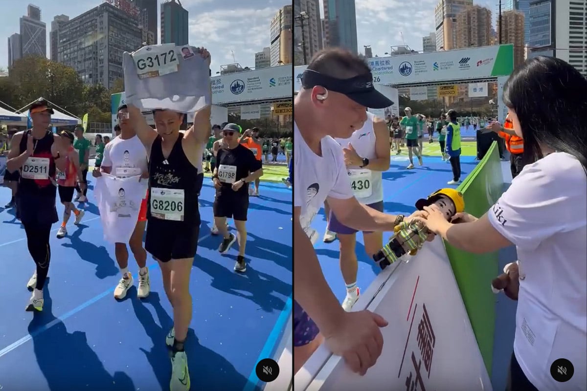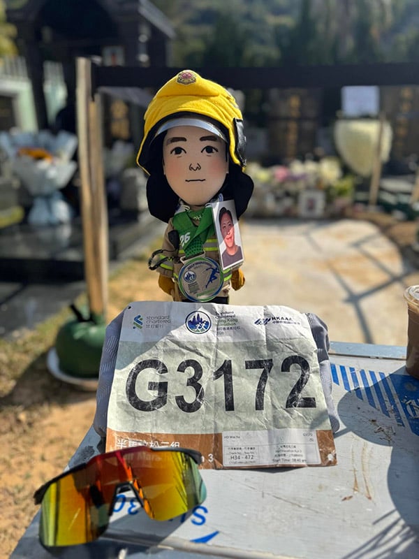 另外還分享了一段影片,有同袍帶著何偉豪的照片,跑完半馬賽事,並在終點線前,高舉何偉豪的跑手號碼布通過終點。另一人在衝線後將消防員公仔交給kiki。