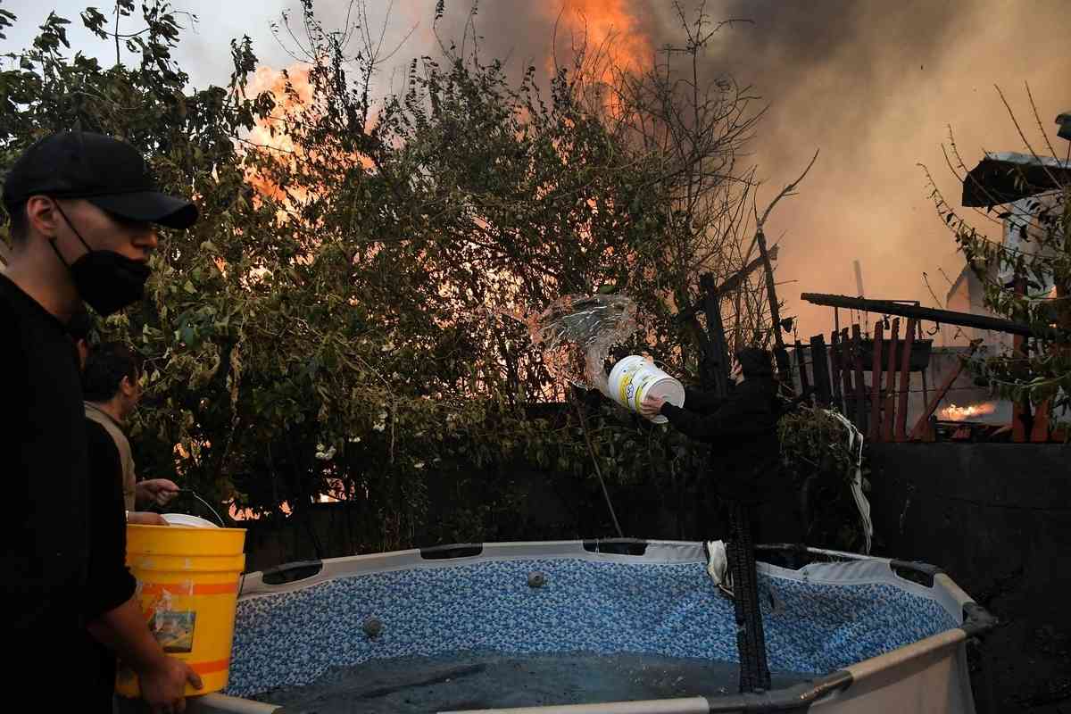 2026年1月18日,智利比奧比奧大區首府康塞普西翁市(Concepcion)發生野火,當地居民試圖撲滅一棟著火的房屋。(GUILLERMO SALGADO/AFP via Getty Images)