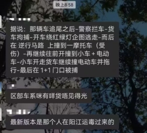 1月19日晚,有網民發帖表示,廣東中山市一輛貨車追尾,遭警察攔截,司機拒捕逃跑時連撞多輛汽車及電動電單車。