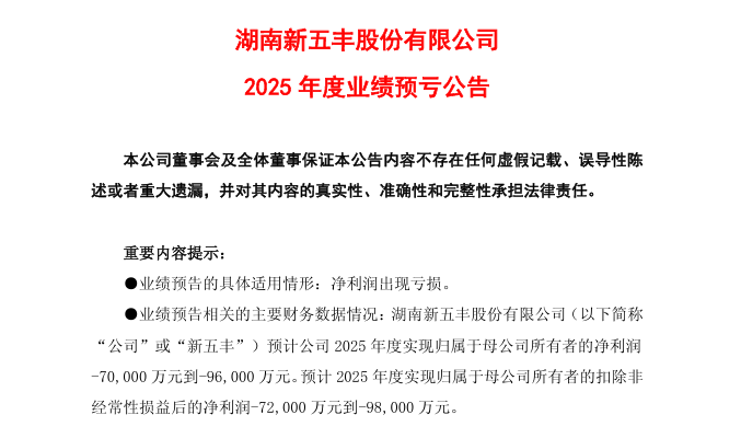 新五豐1月20日發布了《2025年度業績預虧公告》。公告顯示:「預計公司2025年度實現歸屬於母公司所有者的淨利潤-70,000萬元(人民幣,下同)到-96,000萬元。預計2025年度實現歸屬於母公司所有者的扣除非經常性損益後的淨利潤-72,000萬元到-98,000萬元。」「與上年同期(法定披露數據)相比,將出現虧損。」