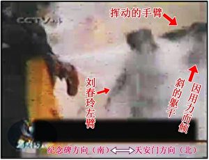 劉春玲點火自焚的地點,是在紀念碑的北側。畫面顯示:……劉春玲身上烈焰在燃燒,她由北向南走,從她南面跑過來四、五個警察,手持滅火器向她頭部及身上猛烈噴霧。劉春玲可能是因為面部被噴的難受,只見她轉身面向北,背朝南,繼續背對著警察的噴霧向南倒著走,此時,她身上的火焰已完全撲滅,警察卻仍然噴霧不止。劉春玲四周煙霧瀰漫……似要隱匿甚麼?