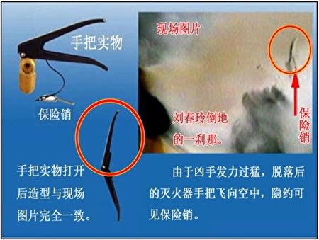 於是,我們得出這樣一個結論:兇手用滅火器打死了劉春玲。儘管這個滅火器的主體沒有出現在畫面中,但從主體上脫落後飛向空中的滅火器手把,已經說明了一切。
