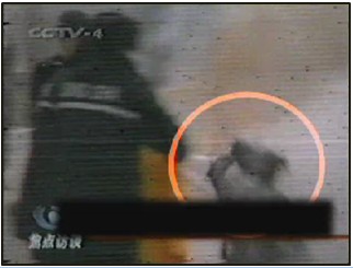 據《焦點訪談》畫面顯示,這個手把飛向空中後,向上、向南作拋物線軌跡運動,大約到達最高點轉為下落時,滅火的一名警察抬頭仰視呈V字形的手把。見下圖。