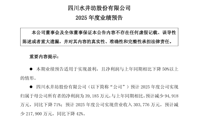水井坊在1月20日發布的《2025年度業績預告》中表示:「預計2025年度公司實現歸屬於母公司所有者的淨利潤為39,185萬元,與上年同期相比,預計減少94,918萬元,同比下降71%;預計2025年度公司實現營業收入303,776萬元,預計減少217,900萬元,同比下降42%。」