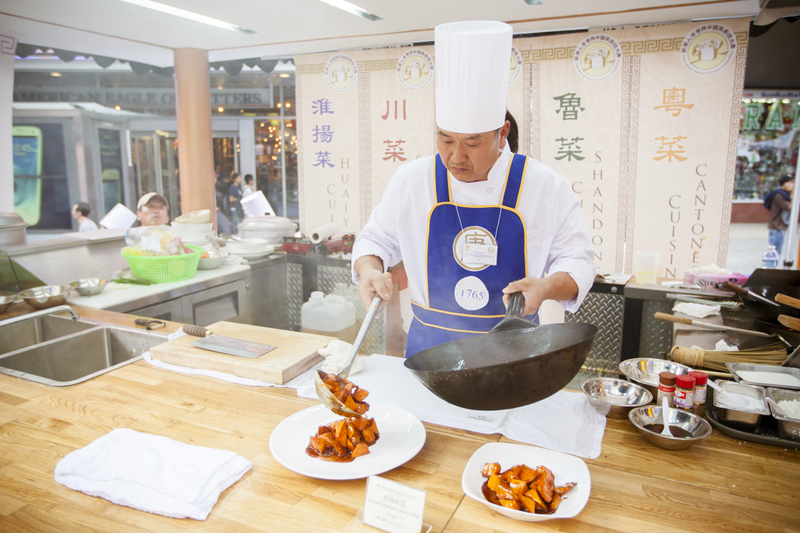 在大蘋果中心,頭戴白色長帽的廚師在煙霧、火焰中,以傳統的技術和食材、配料,不加入任何變異的現代元素,炒出了陣陣誘人的香氣。在眾人期盼下,侍女擡著古風的木枱和精美食器,捧出了一道道色香味俱全,恢復正統的中華南北名菜。