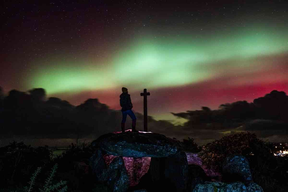 2026年1月19日,法國布列塔尼沿海村莊波特索爾(Portsall), 一名男子站在當地著名巨石遺址Guilliguy一塊已有8,000年歷史的石棚上,欣賞北極光。(Oscar Chuberre/AFP via Getty Images)