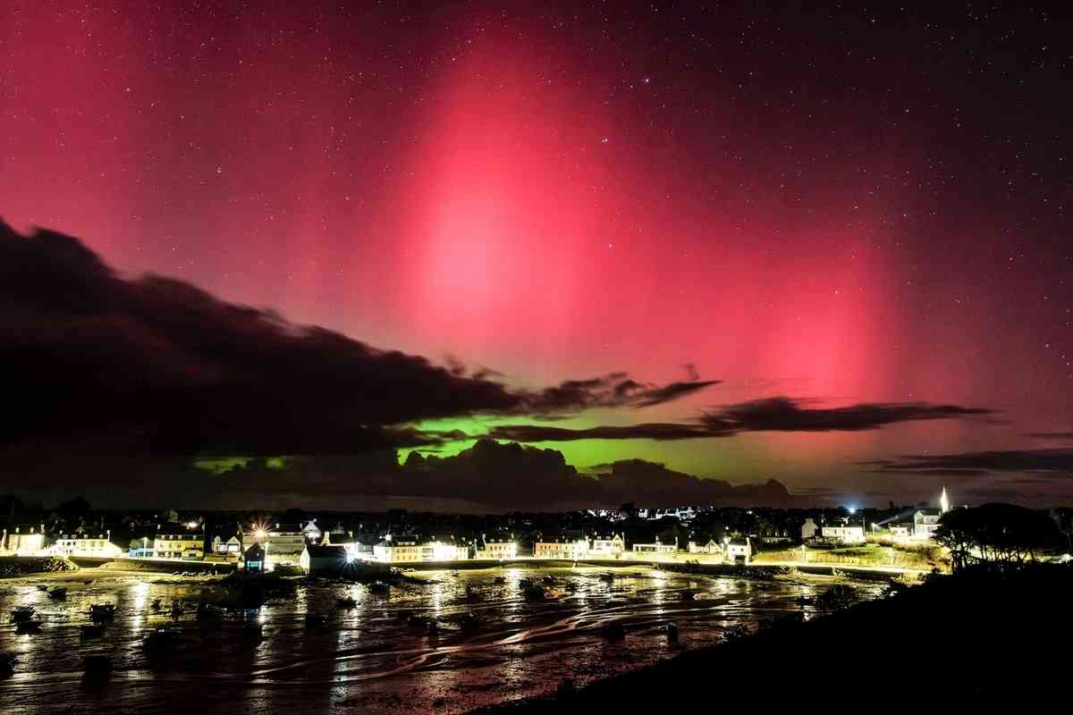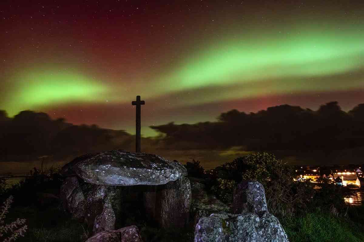 2026年1月20日,法國布列塔尼沿海村莊波特索爾(Portsall),絢爛的北極光照亮了當地著名巨石遺址Guilliguy的夜空。(Oscar Chuberre/AFP via Getty Images)