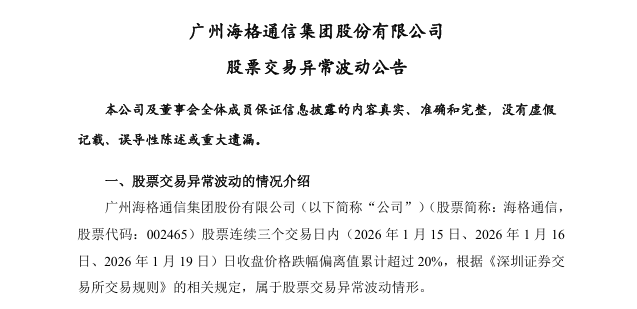 面對股價過山車似的波動,海格通訊不得不在1月20日發布了《股票交易異常波動公告》。公告表示:公司「股票連續三個交易日內(2026年1月15日、2026年1月16日、2026年1月19日)日收盤價格跌幅偏離值累計超過20%,根據《深圳證券交易所交易規則》的相關規定,屬於股票交易異常波動情形」。公告說:「公司近期生產經營情況正常,內外部經營環境未發生重大變化」,而且「公司股票交易異常波動期間控股股東、實際控制人未買賣公司股票」等,以安撫投資者。