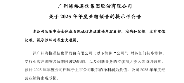 但今年1月15日,海格通訊發布了《關於2025年年度業績預告的提示性公告》。公告表示:「預計2025年年度公司歸屬於上市公司股東的淨利潤為負值,公司2025年年度經營業績將出現虧損。」