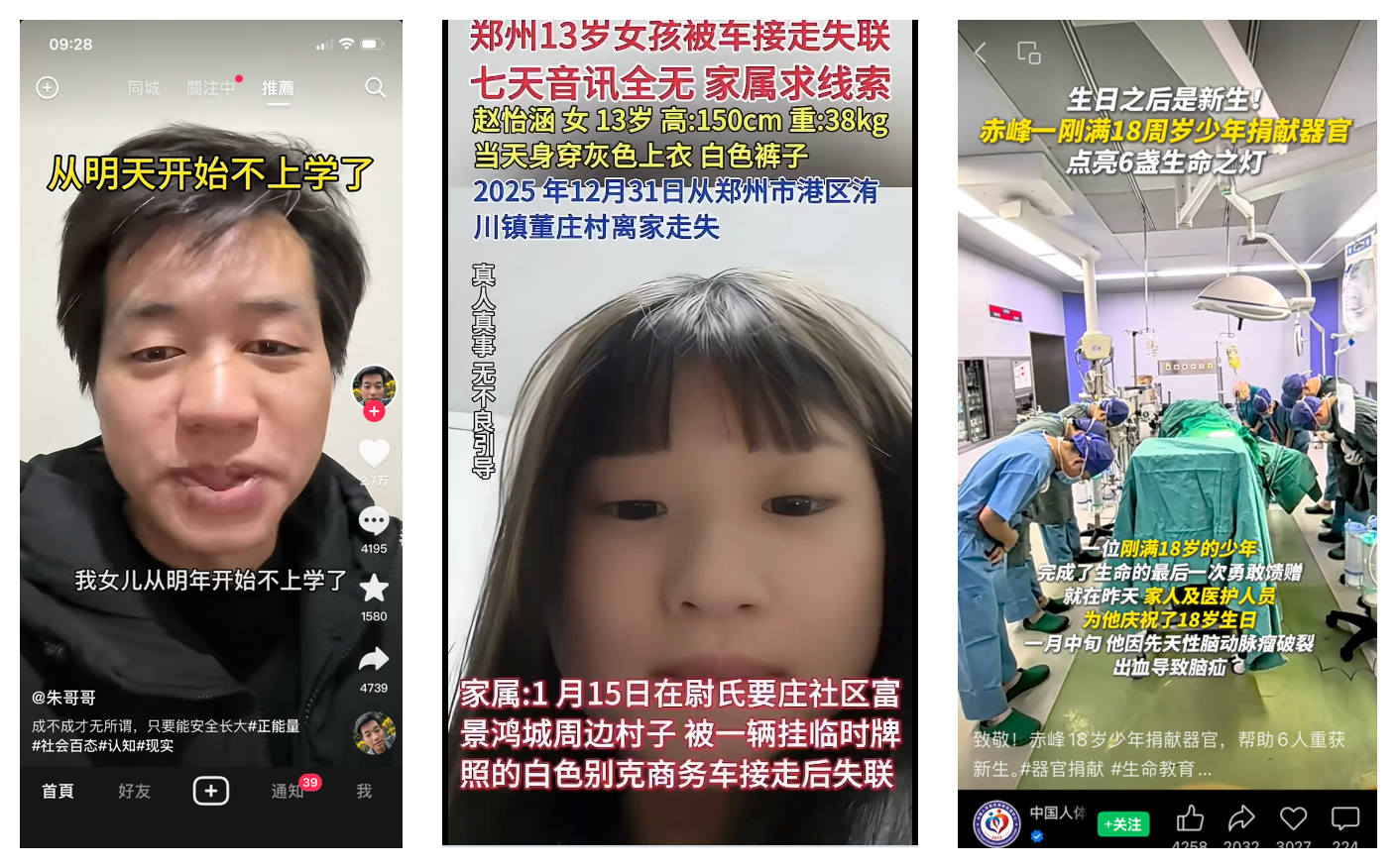隨著網絡上關於「孩子器官被非法移植」的說法持續流傳,社交平台近期又廣泛傳播多則未成年人器官捐獻相關影片。在多重訊息疊加下,大陸多地家長於網絡上集中表達對孩子在校安全的恐懼,並公開表示停止讓孩子繼續上學,一股以「停學保命」為核心的情緒浪潮正在網絡評論區擴散。