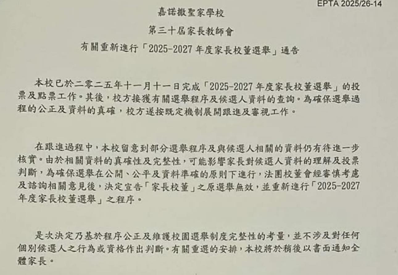 有讀者來訊告知,她女兒就讀九龍城的嘉諾撒聖家學校,去年11月有「家長校董」選舉,但經即場點票而當選的家長(並非讀者本人),竟未能就任家長校董,校方亦一直沒公布當選者。事隔兩個多月,到上周五(1月16日),家長才收到一份學校通告(見本文配圖),指「家長校董」原選舉無效,將安排重新進行選舉,令讀者萬分錯愕,覺得事情很不簡單。