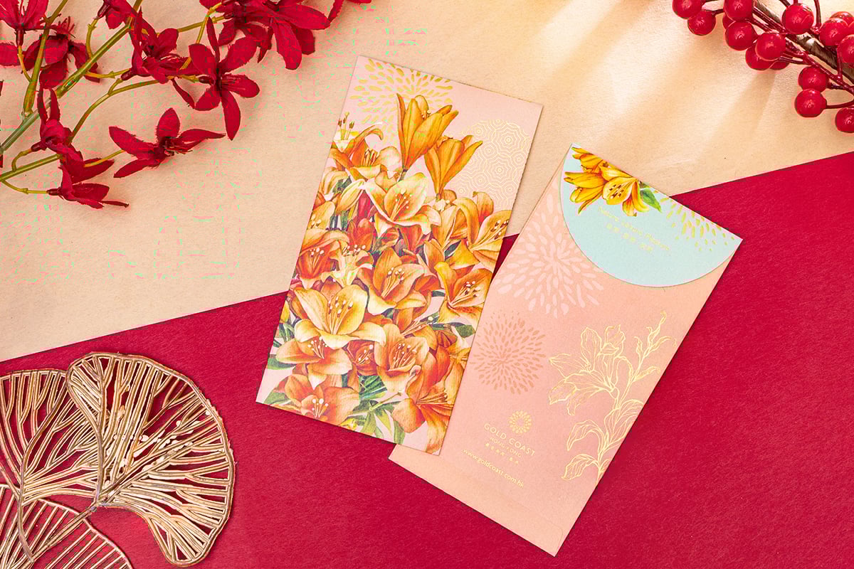 黃金海岸商場今年以「百合」作為主題,推出「吉祥百事合意利是封」 ,為大家送上百合花承載的傳統新年祝願 — 「百事合意,順利順心」。