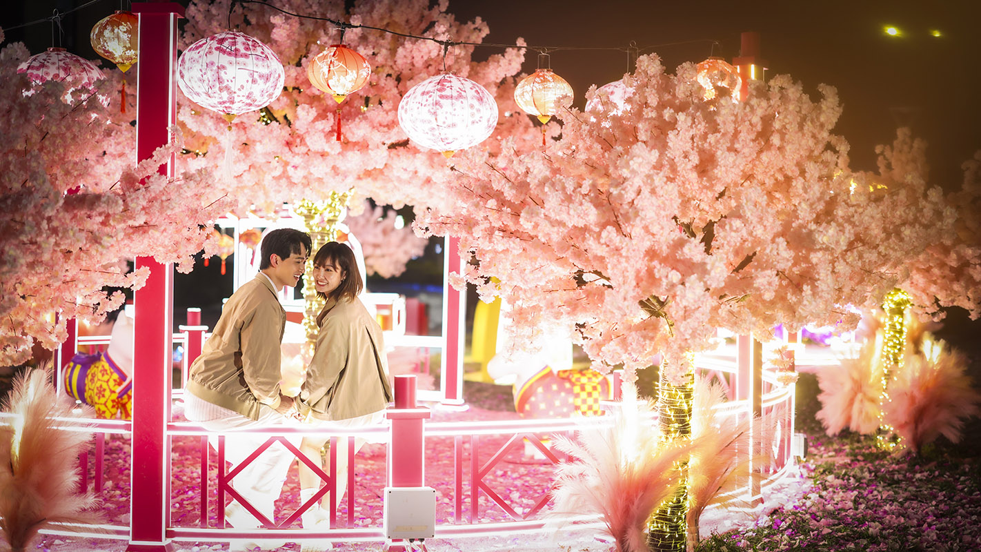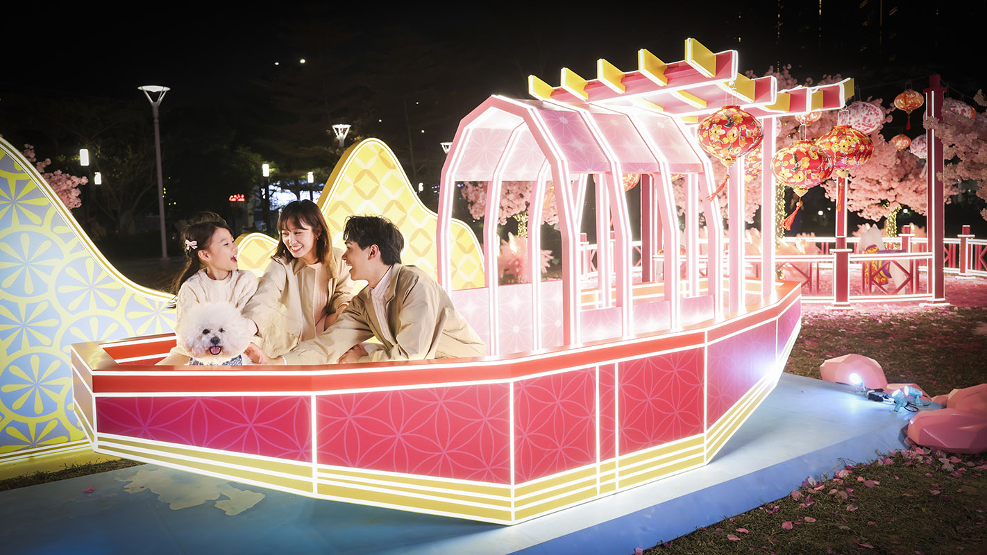 「花見春之園」以柔美粉紅主調及春花意象貫穿全場,精心布置多個夢幻打卡場景:繁櫻環抱的「花舞庭園」;靈感源自園林雅致意境的「花語之亭」;寓意一帆風順、啟航迎福的「花舟迎春」。