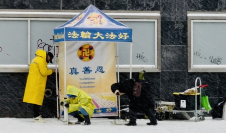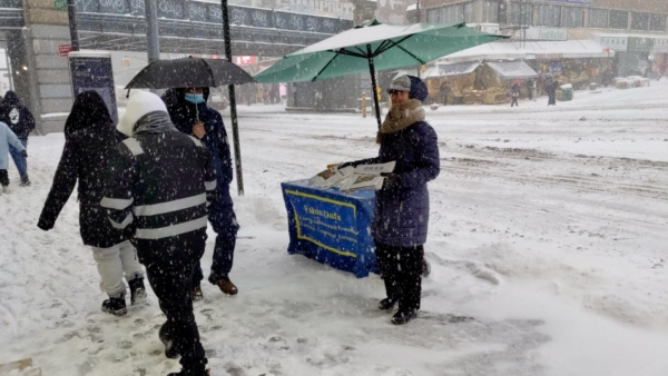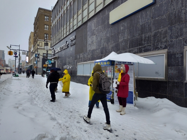 然而,在王后區法拉盛,法輪功學員設立的6處街頭真相點依然如常開放。法輪功學員頂風冒雪、堅守真相點,在嚴寒中向民眾派發資料,講述真相,傳遞「法輪大法好,真善忍好」,勸導華人退出中共黨團隊。