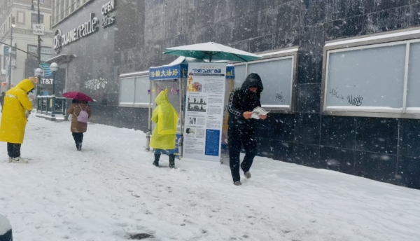 中國民主黨成員桂雲才路過真相點,他說這是他來到紐約後遇到的最大一場雪,「雪幾乎到膝蓋,走路都很困難。」但令他感動的是,「真相點一個都沒少,全都擺出來了。」