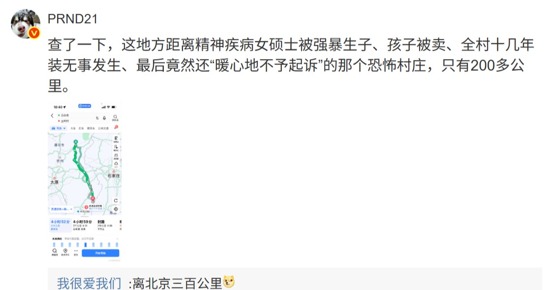 據微博大V「PRND21」留言透露,「這地方距離精神疾病女碩士被強暴生子、孩子被賣,全村十幾年裝無事發生,最後竟然還『暖心地不予起訴』的那個恐怖村莊,只有200多公里。」
