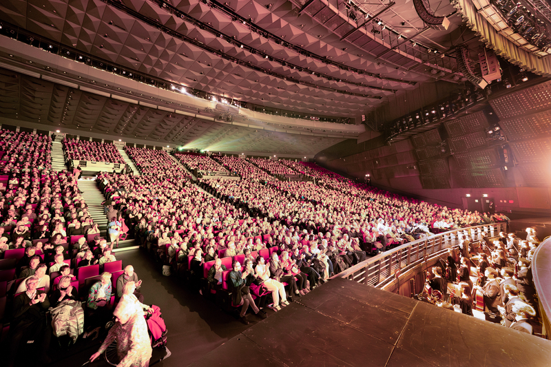 在能容納3,700名觀眾的劇院裏,座椅排列呈扇形,使舞台視角最大化,座位分布分為前廳、中層和上層三大區域,最高排座位到舞台距離約50米,通過傾斜的觀眾席和階梯式結構設計,觀眾仍能完整觀看舞台全景。