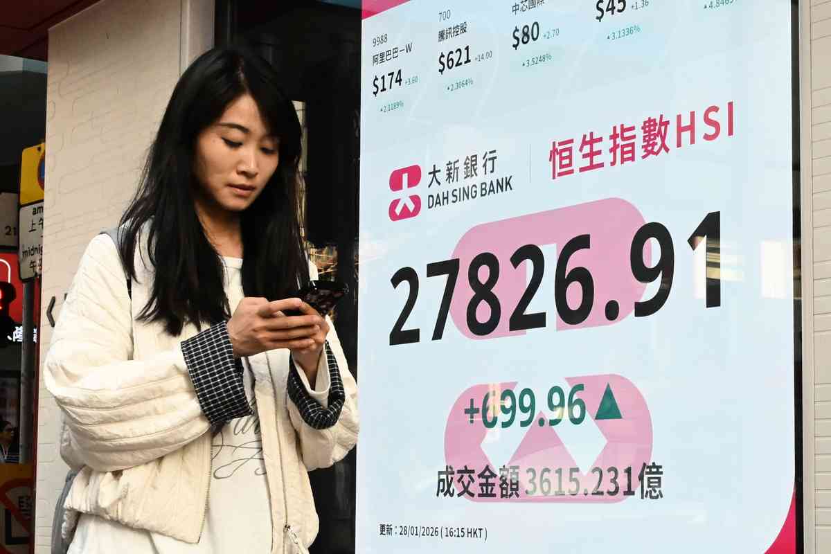 美股道指昨夜疲弱,但納指造好,亞太股市向上,惟印尼因MSCI質疑其可投資者性而大挫7.6%,港股顯著高收。恒指今(28日)早高開198點,隨後一條直線向上,收市報27,826點,大漲699點(即升2.6%),成交額3,615億。國指升2.9%、科指走高2.5%。
