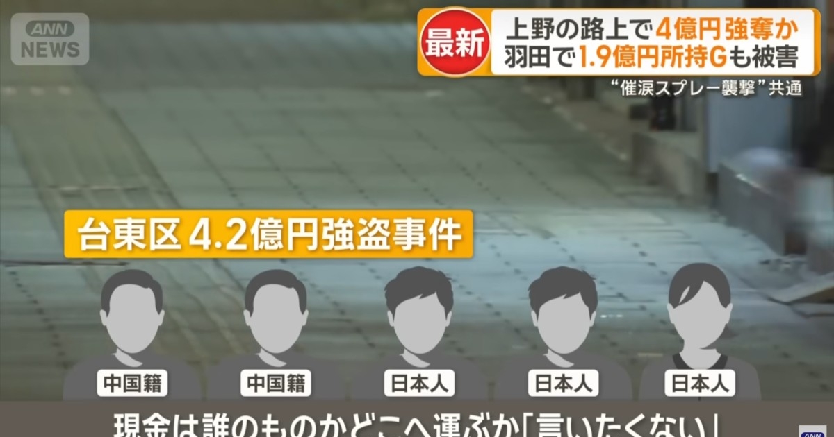 日本東京都昨(1月29日)晚到今晨發生兩宗有關搶劫鉅款的案件,第一宗案件是在上野地區的街頭,3個裝著現金4億日圓的行李箱被搶。第二宗案件為羽田機場停車場有兌換外幣的業者遇襲。兩宗案件受害人均被噴灑像是辣椒噴霧的東西,警方認為案件有關聯,正在追查疑犯的下落。