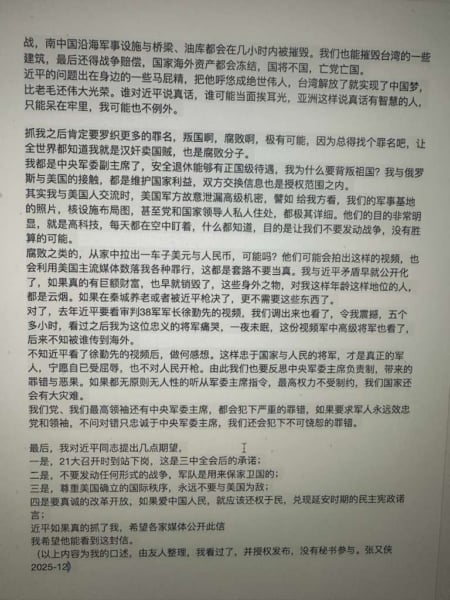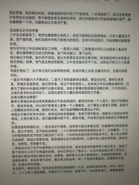 (編者按:中共軍委副主席張又俠和軍委委員劉振立1月24日被官方宣布調查後,大紀元記者拿到下面爆料人提供的張又俠被捕之前寫的密信,目前無法核實真偽。)