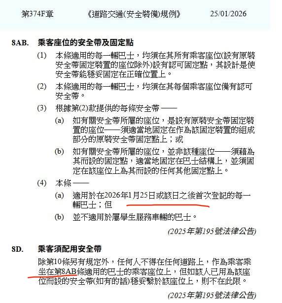 這講法完全顛覆了港府一直以來的宣傳。我細閱《道路交通(安全裝備)規例》條文,發現江玉歡確有道理。第8AB條規定「在2026年1月25日或該日之後首次登記的每一輛巴士」,都必須在所有乘客座位裝置安全帶。然後第8D條「乘客須配用安全帶」寫道: