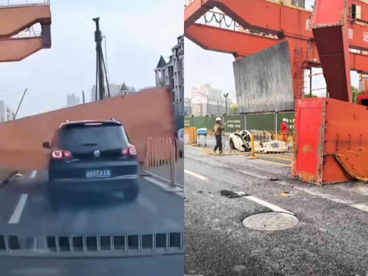 網傳行車記錄儀拍攝的現場畫面顯示,一輛白色車輛在行駛過程中,突然被從旁邊倒下的龍門吊支腿砸中,導致車尾幾乎完全被壓扁,後面尾隨的黑色車輛車頭一部份也被砸損。