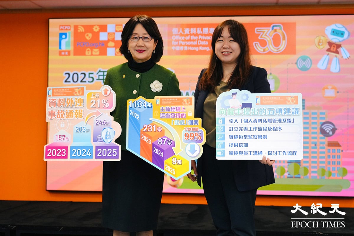 個人資料私隱專員公署今日(3日)發表2025年的工作報告。根據統計,去年收到4,228宗投訴個案,較前年的3,431宗上升約23%;資料外洩事故通報共246宗,按年增約兩成;公署去年處理的「起底」個案共308宗,較前年的442宗減少三成。
