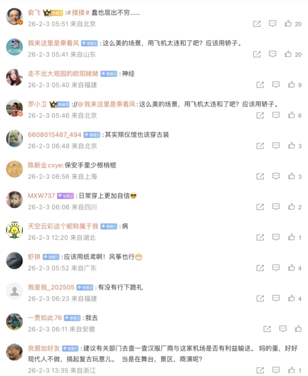 還有網民調侃,「這麼美的場景,用飛機太違和了吧?應該用轎子。」「其實殯儀館也該穿古裝。」「穿上石器時代更有噱頭。」「建議有關部門去查一查漢服廠商與這家機場是否有利益輸送。好好現代人不做,搞起復古玩意兒。 當是在舞台,景區,商演呢?」「蠢也層出不窮⋯⋯」「儼然廣州人給先人化寶的紙紮公仔。」